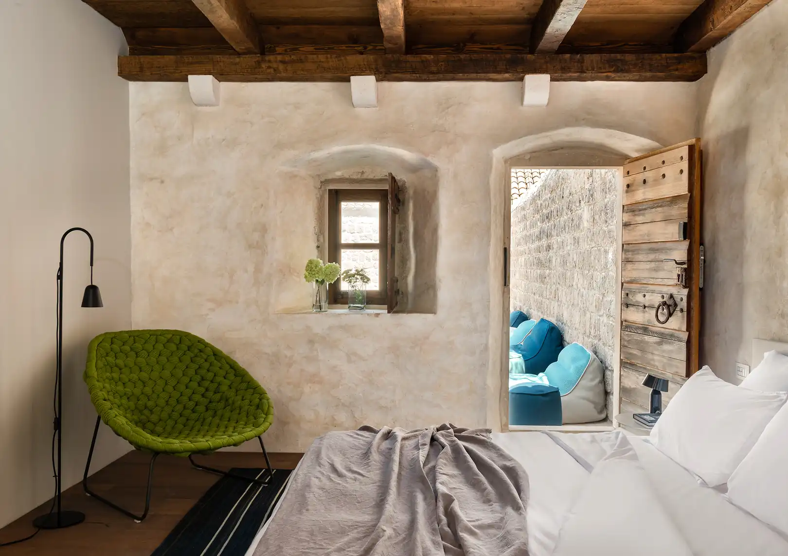 - The room’s door leads to the cloister’s terrace, perfect for a family breakfast